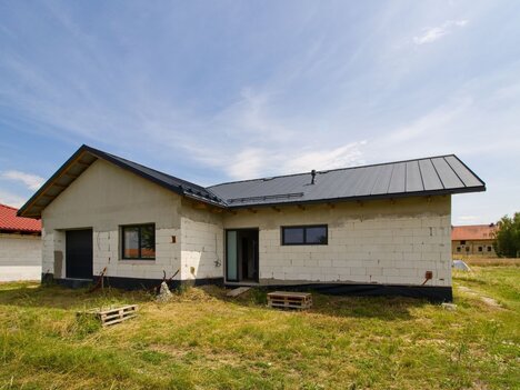 Nabízím ke koupi novostavbu rodinného domu k dokončení, která splňuje vysoké standardy moderního a úsporného bydlení a je ideální volbou pro rodinu hledající komfort, prostor i energetickou efektivitu. Rodinný dům o dispozici 5kk s garáží se sekčními vraty na el. pohon je navržen jako přízemní, nepodsklepený, ve tvaru nepravidelného „T“, se dvěma sedlovými střechami se sklonem 25°. Jednoduché a čisté architektonické řešení přirozeně zapadá do okolní zástavby. Podkroví není určeno k využití. Dům je postaven z kvalitních stavebních materiálů dostupných na českém trhu. Obvodové zdivo je tvořeno z tepelněizolačních tvárnic YTONG Lambda YQ o tloušťce 500 mm. Vnitřní nosné a příčkové stěny jsou rovněž z tvárnic YTONG různých typů a tlouštěk. Střešní konstrukce je ze styčníkových dřevěných vazníků se zateplením a sádrokartonovým podhledem. Střešní krytinu tvoří plechové šablony RUUKKI Classic Design D. Dům bude vytápěn elektrickým podlahovým topením v kombinaci s tepelným čerpadlem vzduch–vzduch Daikin Multisplit, které bude zároveň sloužit jako klimatizace. Na střeše je plánována instalace fotovoltaické elektrárny s 20 panely a bateriovým úložištěm v technické místnosti. Ohřev teplé vody elektrickým zásobníkem v kombinaci s FVE. V obývacím pokoji je umístěn krb s krbovou vložkou, který přispívá k tepelnému komfortu. Obytné místnosti mají dostatek přirozeného denního světla. V domě jsou instalována plastová okna, včetně posuvných portálů a fixních zasklení, osazená izolačním trojsklem pro zajištění výborných tepelně-izolačních vlastností. IS: - Zásobování vodou je řešeno z nově navrženého vodovodního řadu. - Kanalizace dočasně do odpadní jímky BIOWA, po vybudování veřejné kanalizace bude dům napojen na veřejný kanalizační řad. - Přípojka elektro nově vybudovaná na základě smlouvy s ČEZ Distribuce a.s. Na pozemku je mimo navrženého chodníku z dlažby BEST plánováno jedno parkovací stání. Obec Vetlá je klidná a malebná vesnice v okrese Litoměřice, součástí obce Vrbice. Nachází se jen 7 km od Roudnice nad Labem a 46 km od Prahy. V obci se nachází obchod s potravinami, dětské hřiště, kulturní dům, základní občanská vybavenost je dostupná také v nedaleké Vrbici či Roudnici nad Labem (mateřská a základní škola, obchod, pošta, lékař, restaurace). Dopravní obslužnost zajišťuje pravidelná autobusová linka č. 685 s napojením na Roudnici nad Labem a okolní obce. Obec Vetlá je ideální místo pro klidné bydlení s dobrou dostupností do města. Kompletní projektová dokumentace a veškeré podklady jsou k dispozici u makléřky.