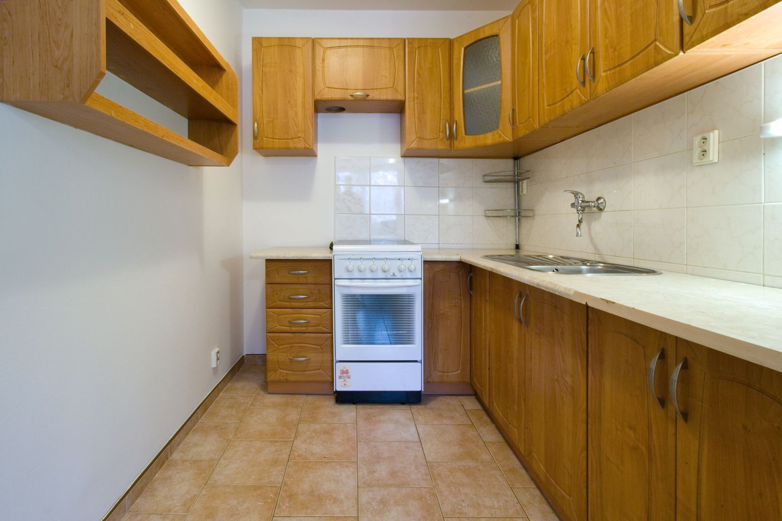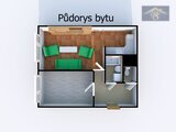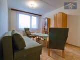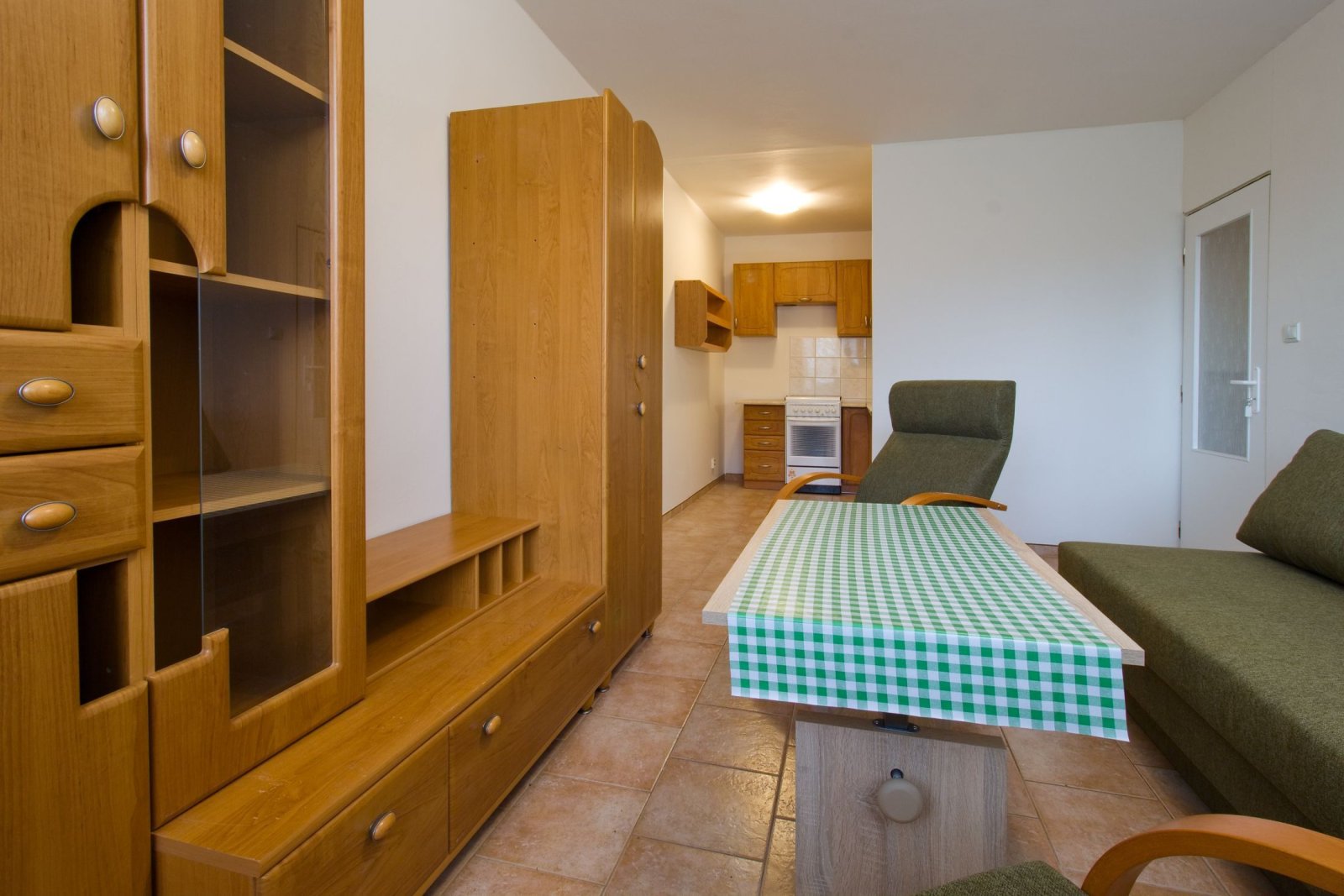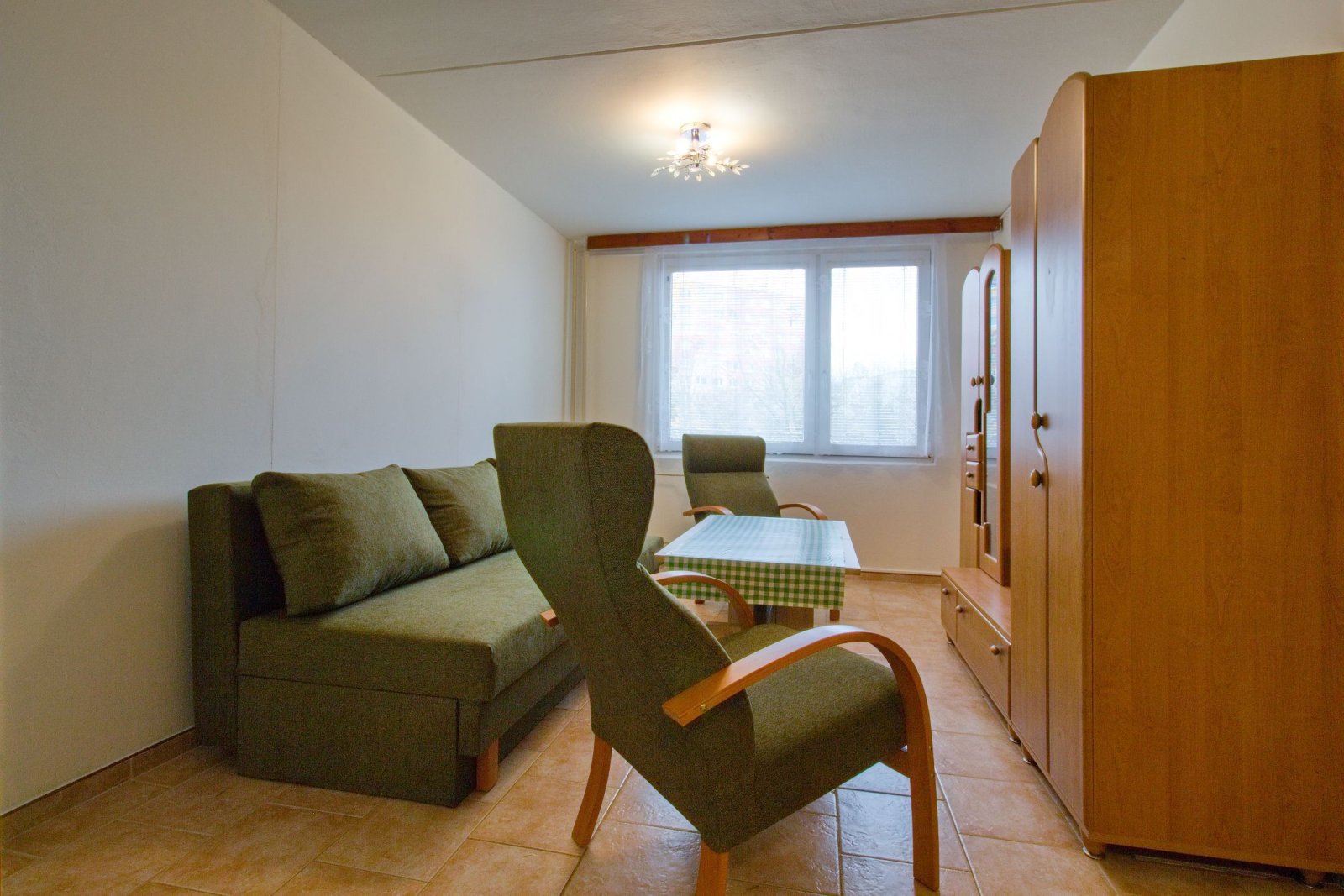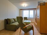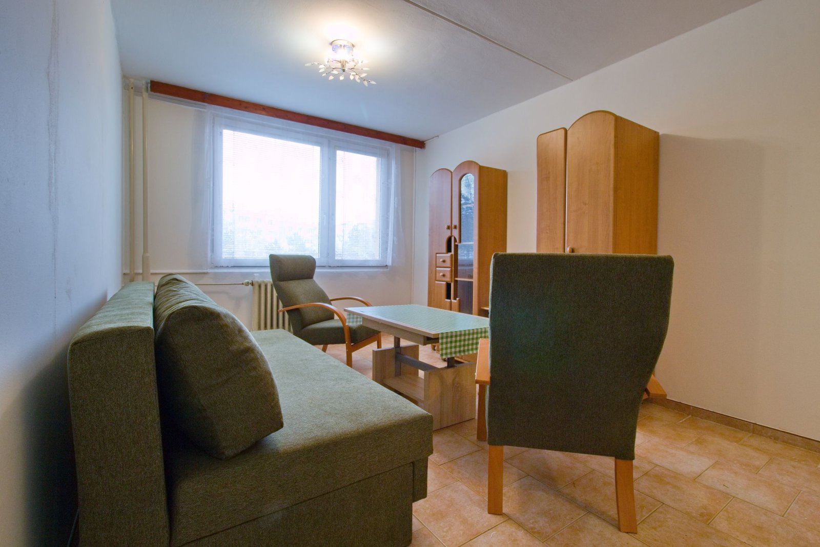Byt je částečně vybavený – kuchyňská linka, obývací stěna, křesla,
