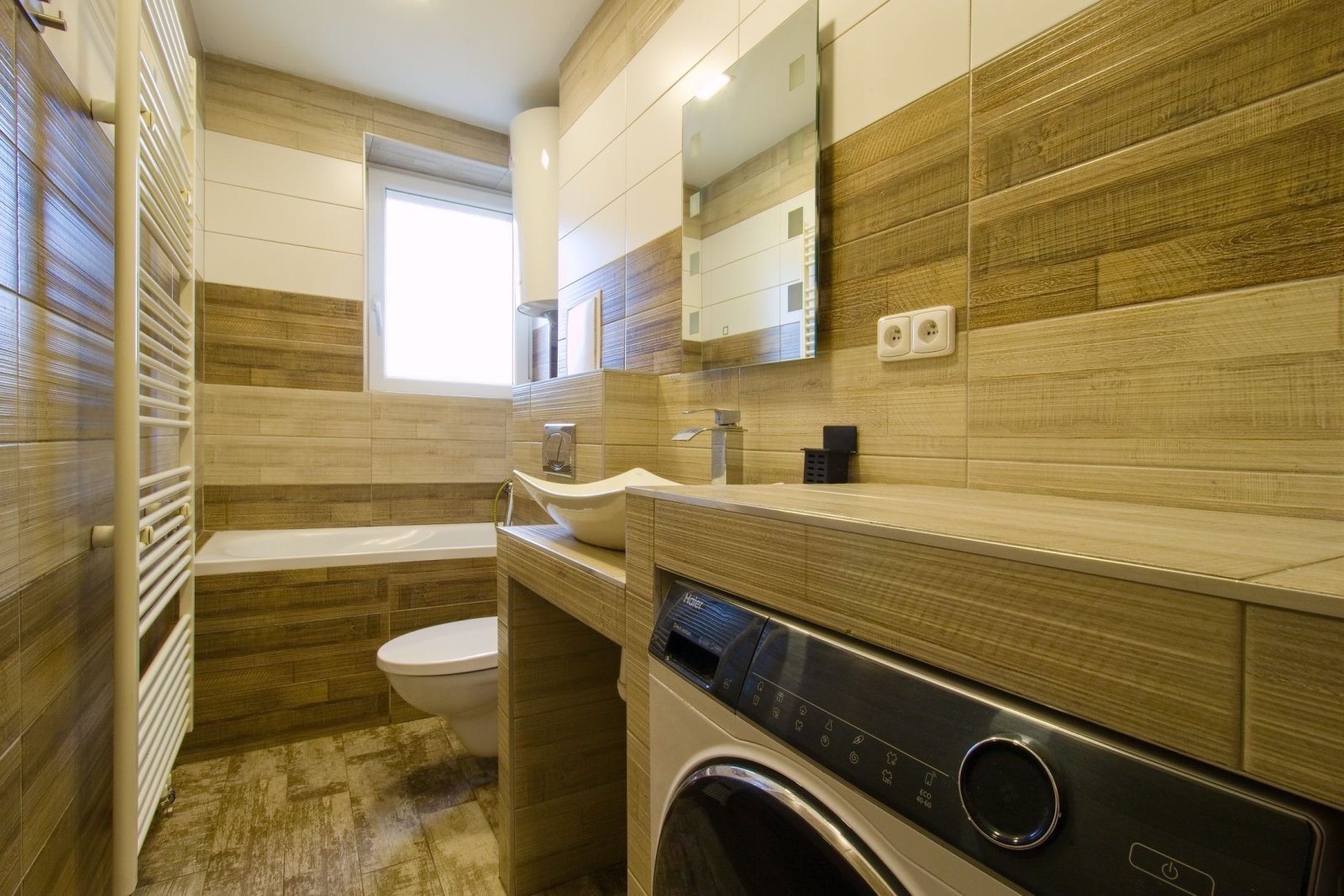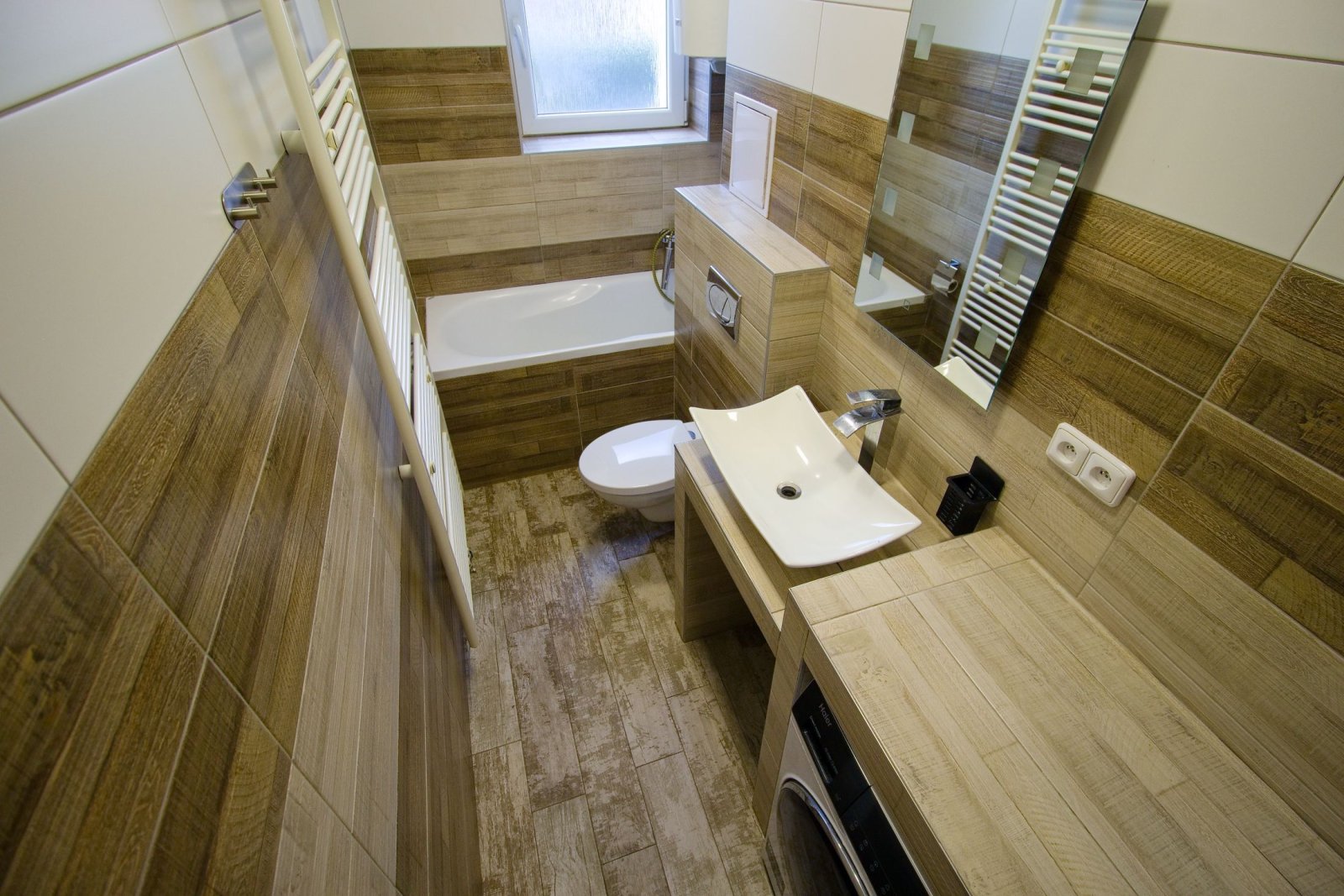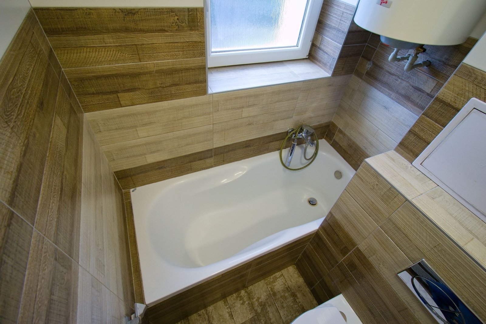 Koupelna nabízí vanu, závěsné WC Geberit, topný žebřík a prostor pro
