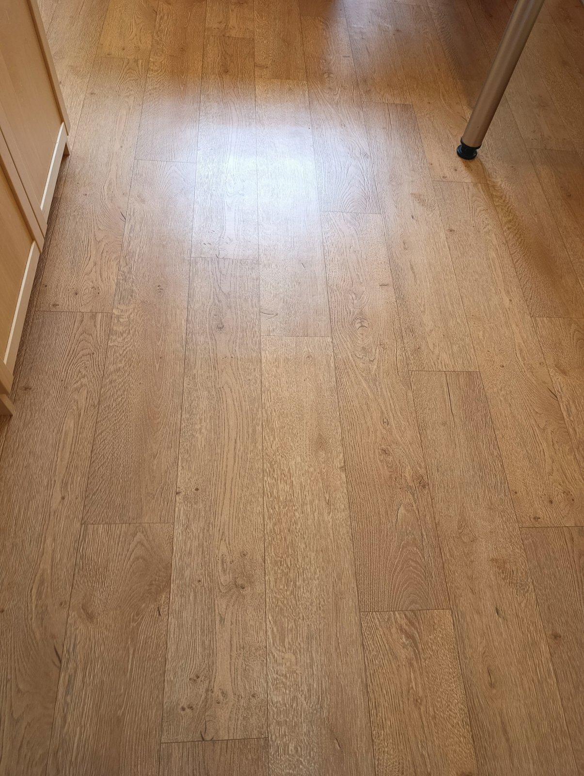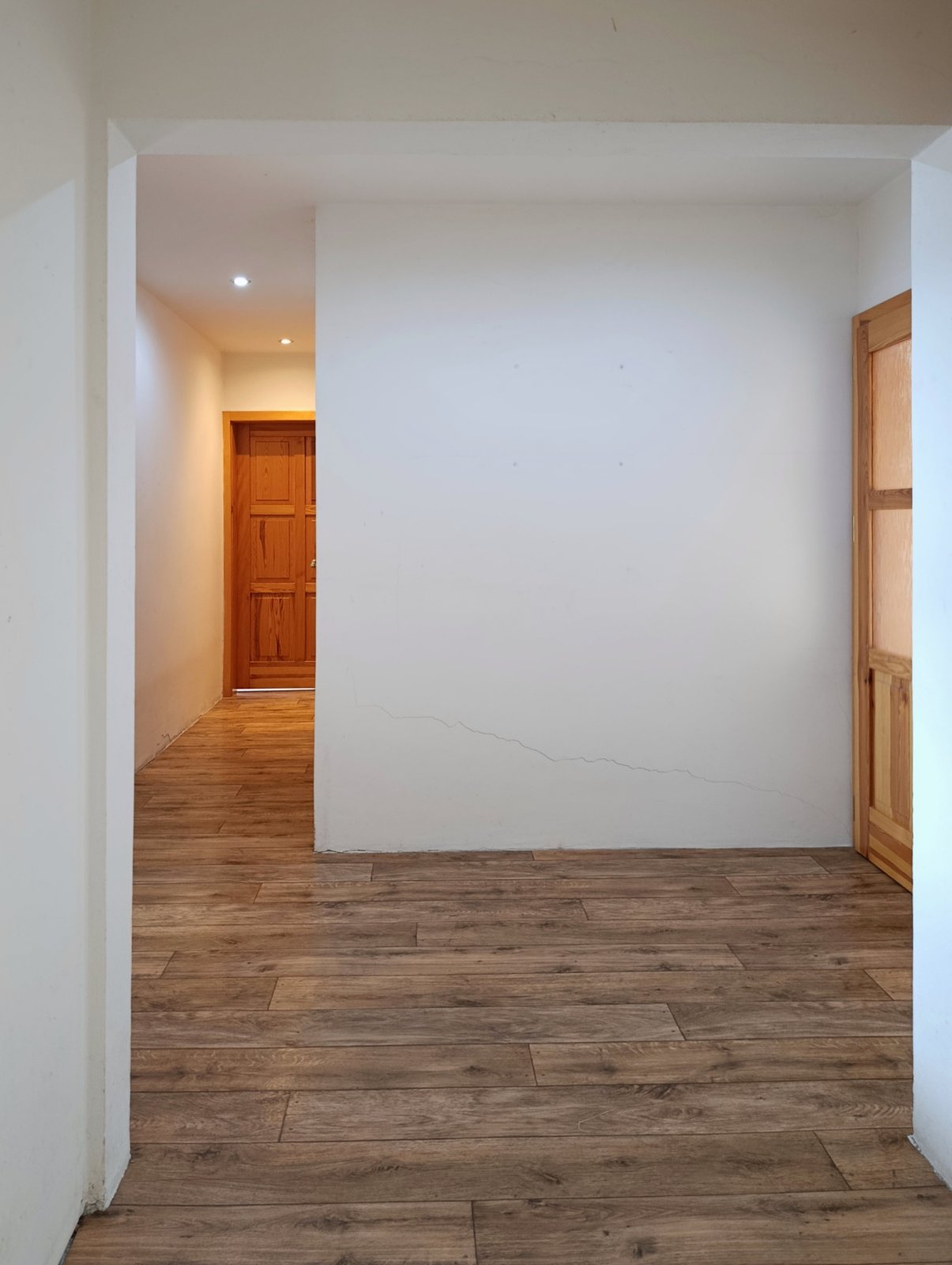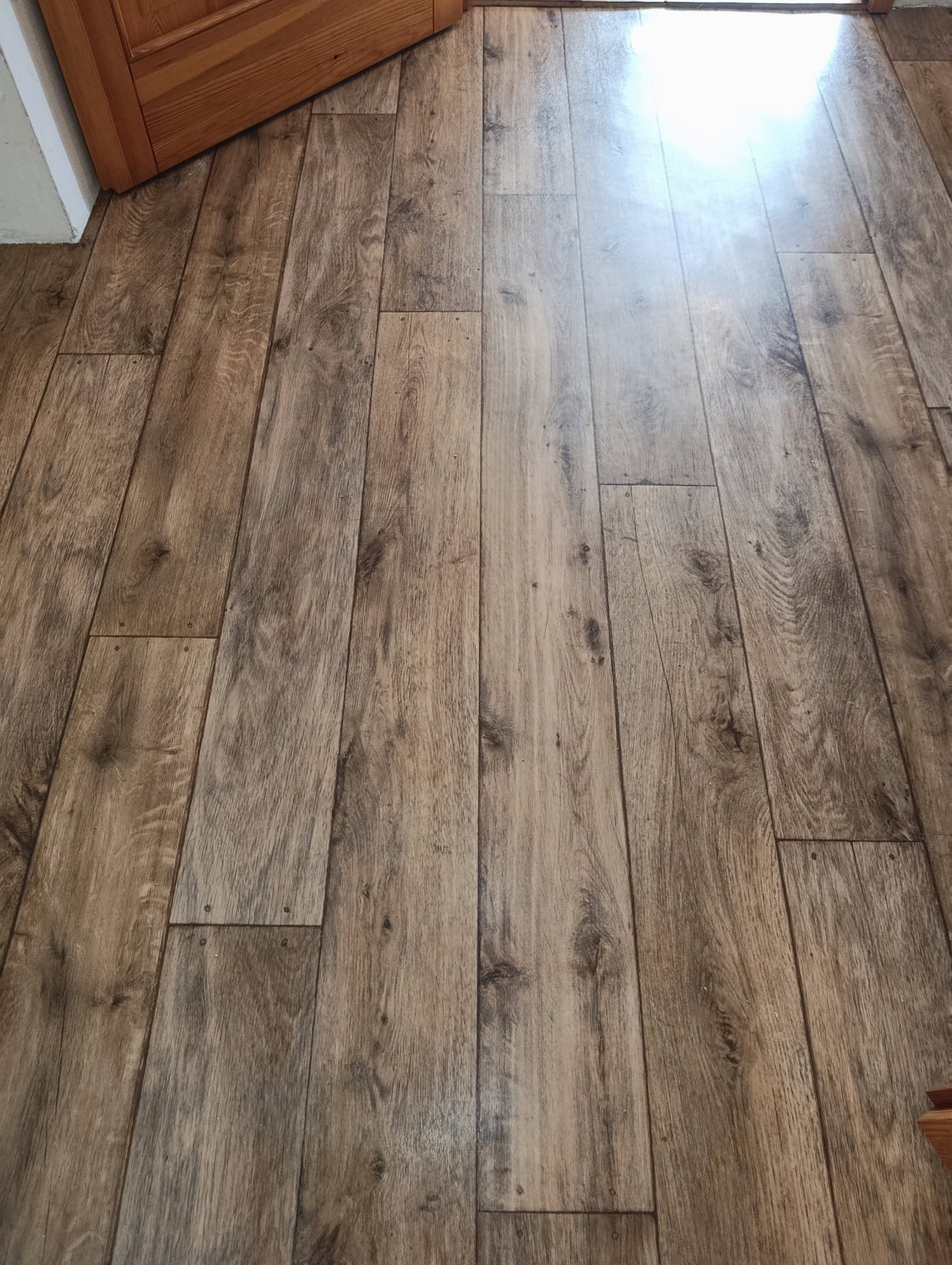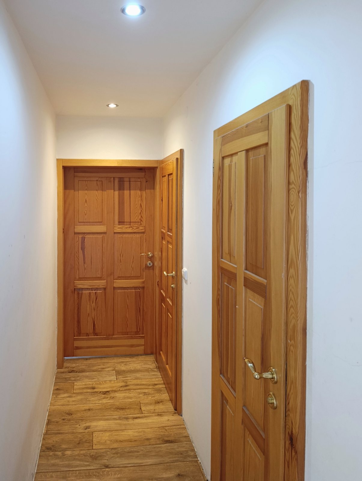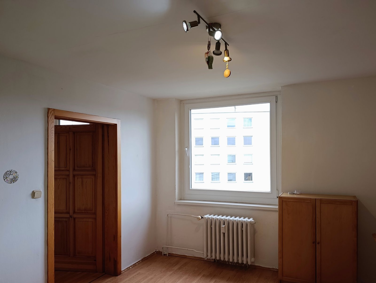 Podlahy v bytě plovoucí a lino. Topení řešeno radiátory, v koupelně a