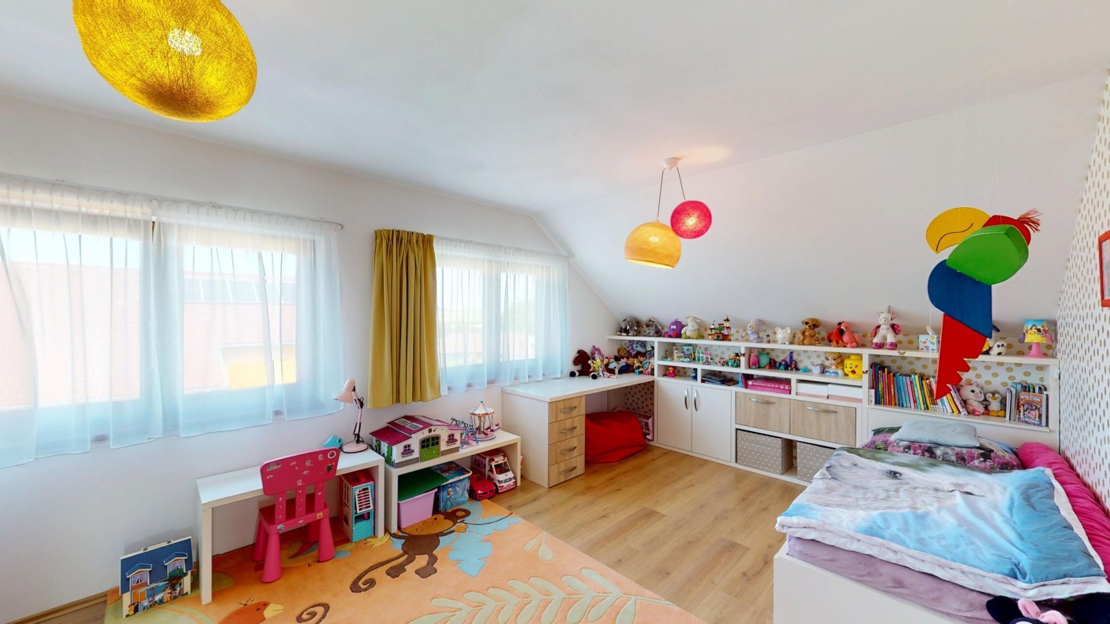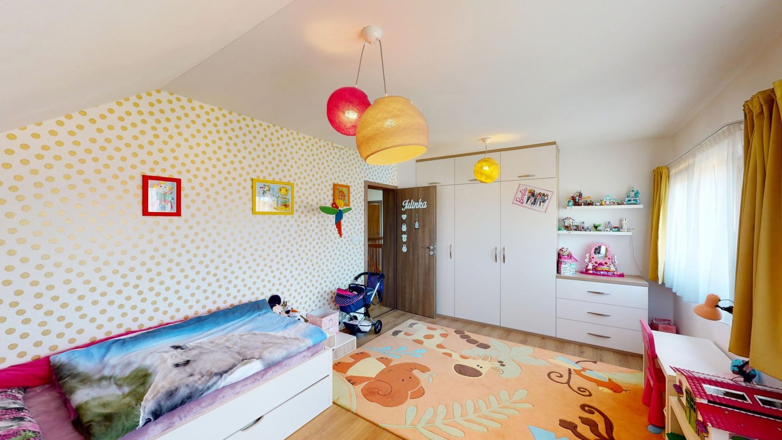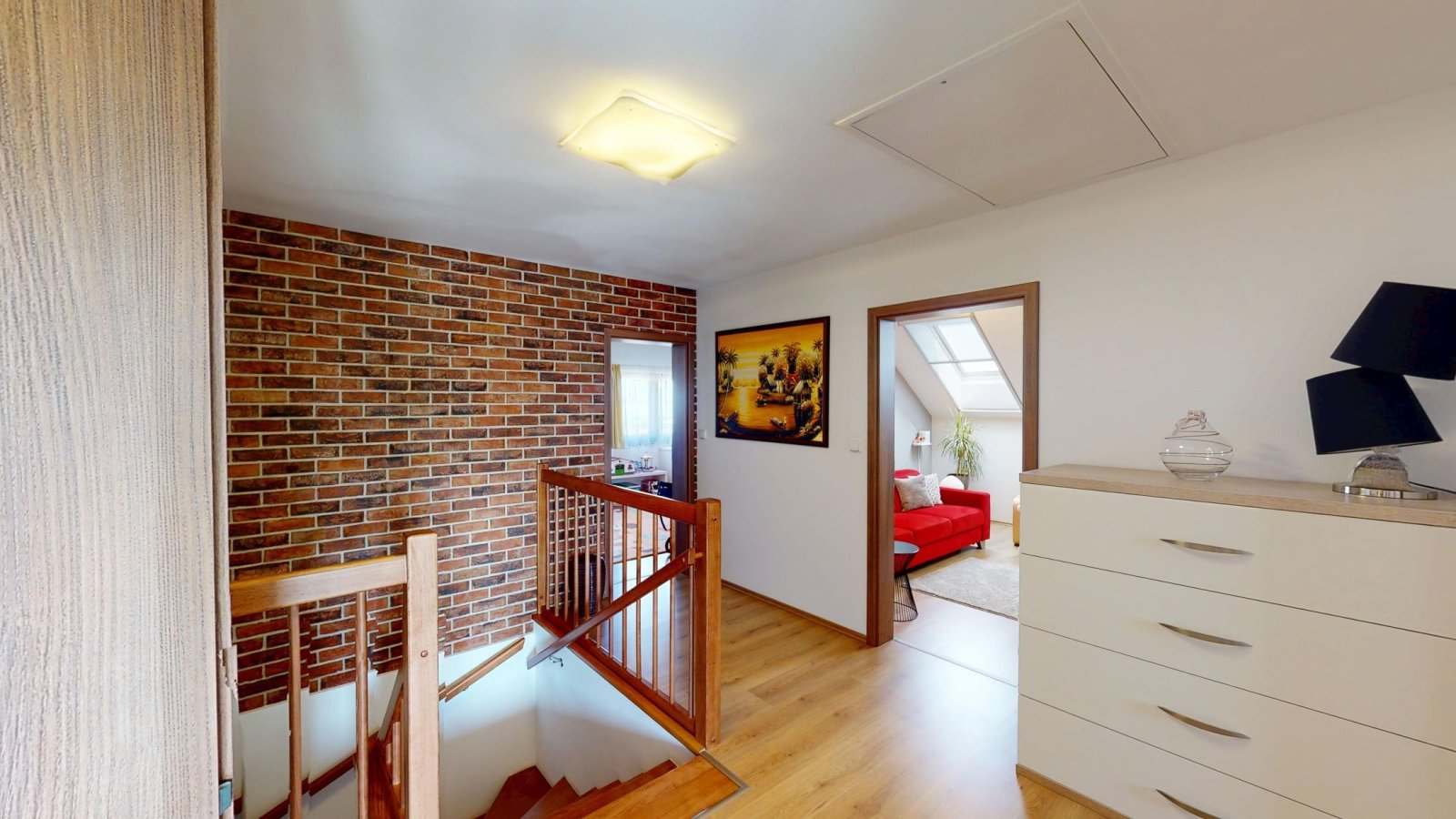 V patře se nacházejí čtyři samostatné pokoje, šatna a koupelna