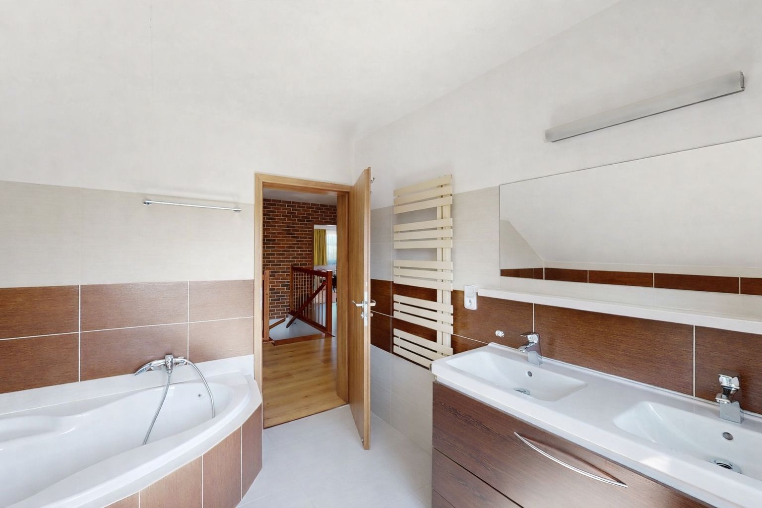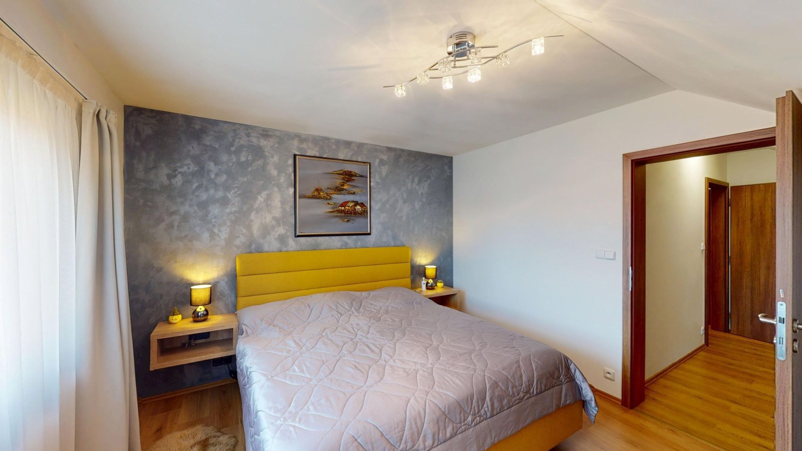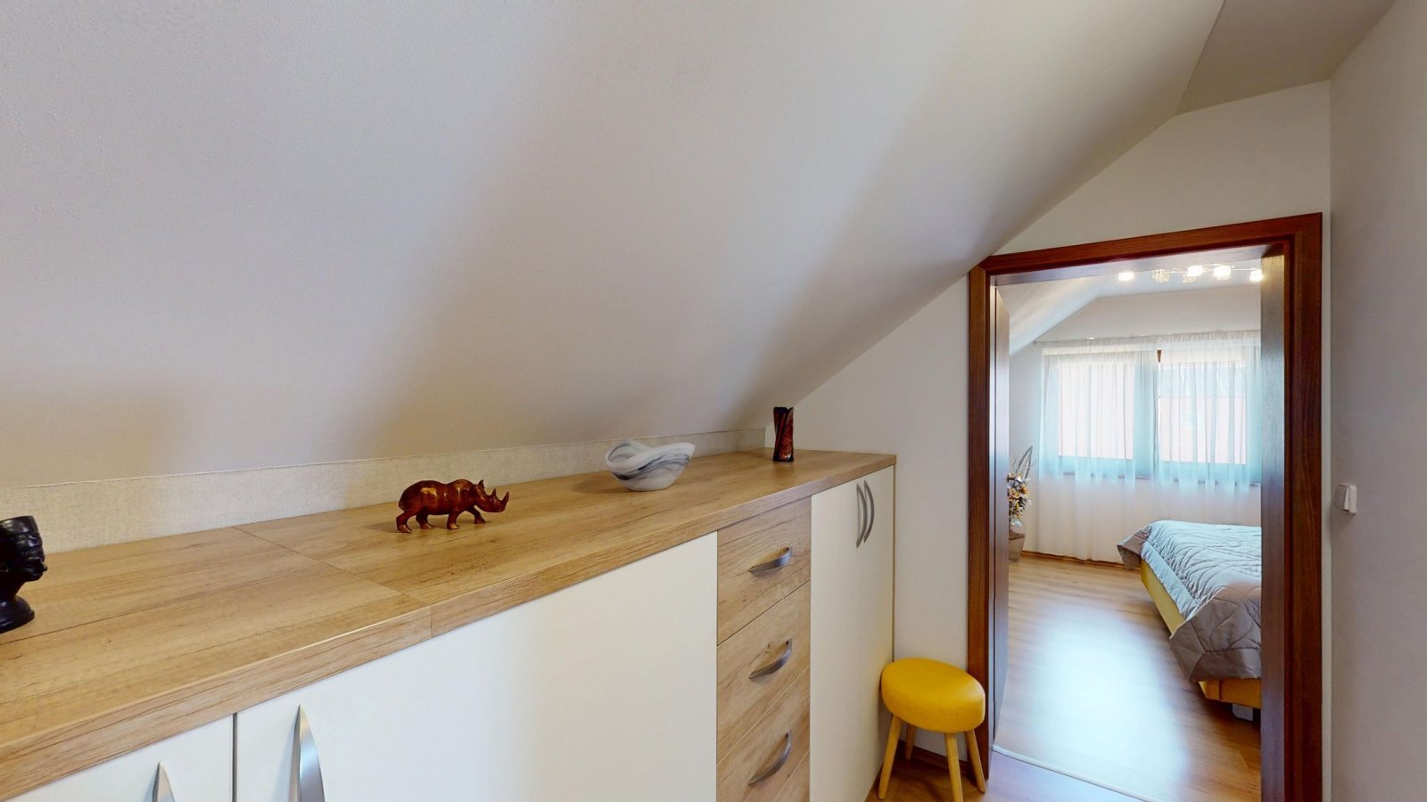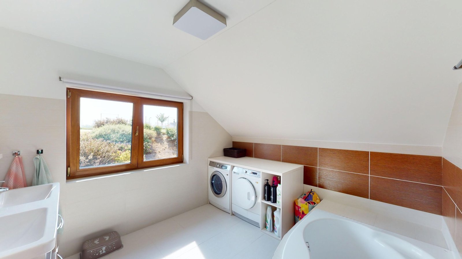 V patře se nacházejí čtyři samostatné pokoje, šatna a koupelna