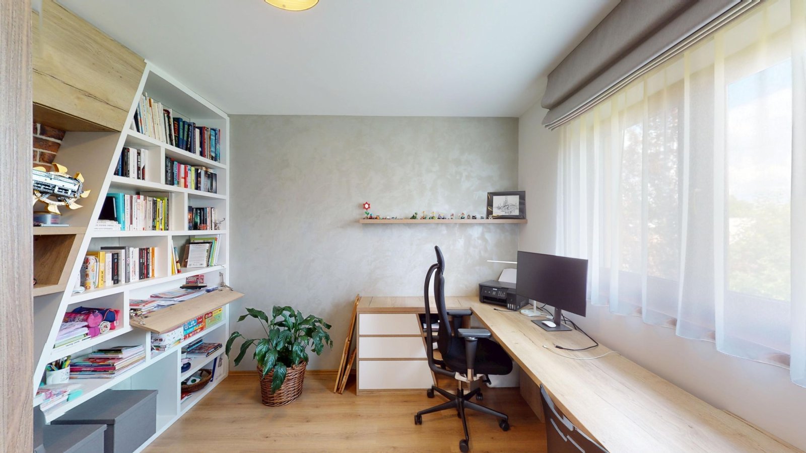 pracovny, na který plynule navazuje kuchyň se spíží. Celý prostor působí