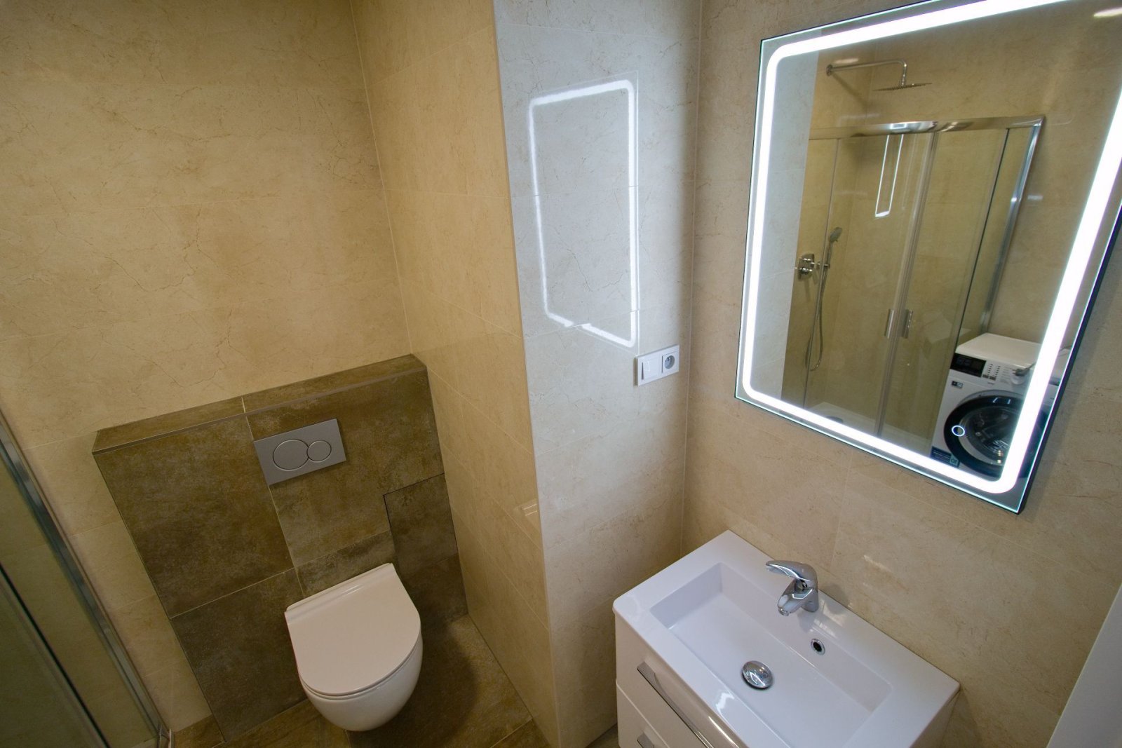 s podsvícením, pračka a topný žebřík. Keramická dlažba a obklady